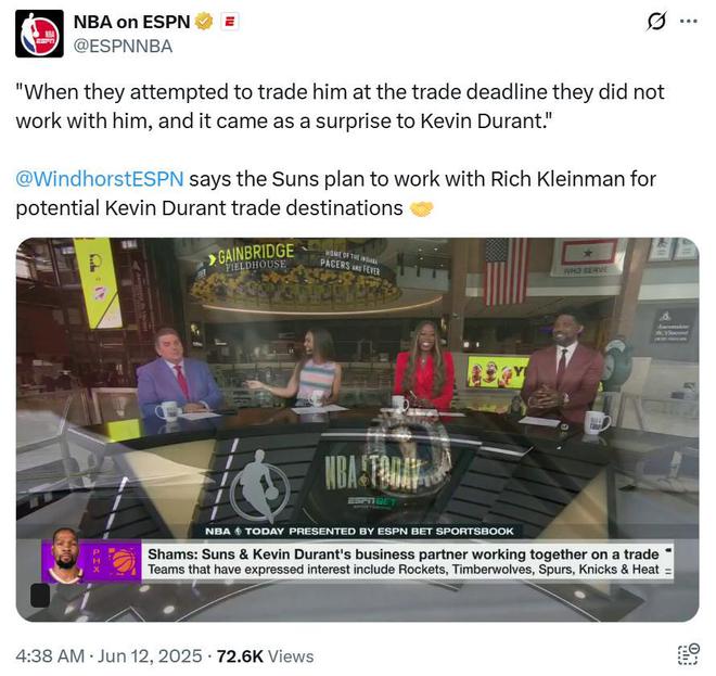 值得一提的是,ESPN记者Brian Windhorst在节目中谈到这一话题时,公开表示赛季中期太阳队在没有沟通的情况下偷偷与勇士队讨论杜兰特交易,让后者与其经纪人感到震惊。